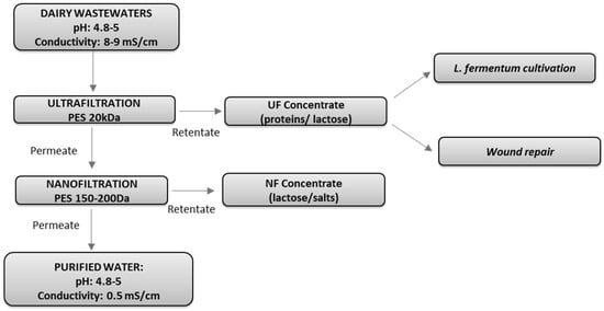 In line with current circular economy approaches, a waste material from one of the production sectors of excellence of the Campania region, namely the dairy industry, was processed and recovered to obtain on the one side purified water for cleaning use within the manufacturing facility, and on the other a spray-dried concentrate that could be tested as substrate for the growth of L. fermentum and as bioactive compound useful in promoting tissue regeneration. An overview of the process approach is presented in Figure 1.