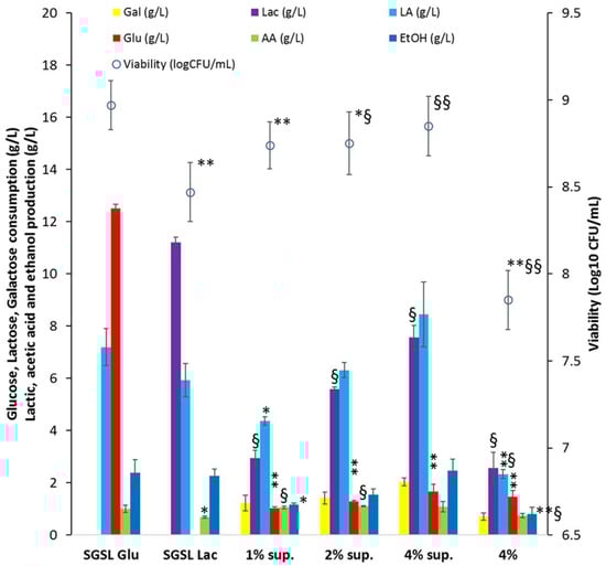 Small-scale experiments performed in 100 mL bottles at 37 °C and 150 rpm. Gal, galactose; Lac, lactose; Glc, glucose; LA, lactic acid; AA, acetic acid; EtOH, ethanol. Sup indicates media in which UF_Ret20Pow was reconstituted in SGLS medium. Data were analyzed by two-tailed non homoscedastic Student’s t-test. * indicates p < 0.05 compared to results obtained on SGLS Glu; ** indicates p < 0.01 compared to results obtained on SGLS Glu; § indicates p < 0.05 compared to results obtained on SGLS Lac; §§ indicates p < 0.01 compared to results obtained on SGLS Lac.