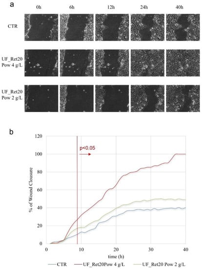 Wound healing assay (a) Representative field of view of HaCat scratch assays during time course of the experiments. At least five fields of view for each sample were analyzed; (b) Quantitative analyses of wound closure as percentage over time. Data significance was analyzed by two-tailed non homoscedastic Student t-tests. The vertical line in the graph indicates the time point from which a significant difference of wound closure % was observed between the CTR and the UF_Ret20Pow 4 g/L treated sample. CTR, control.