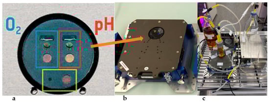 (a) the optical window of the sensor array showing the detectors for dissolved oxygen (blue rectangle, top left), pH (red rectangle, top right), and optical density (green rectangle, bottom); (b) the optical sensor array with the arrow pointing to the optical window; and (c) the complete bioreactor system with the bioreactor flask atop the optical array.