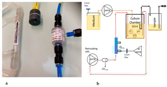 Three filter technologies. (a) From left to right: the PDMSXA-100 cm2 (PDMS) filter, the Evenflow flat membrane filter, and Liqui-Cel filter; (b) schematic of the bioreactor system showing the filter location (in blue) downstream of the recirculating pump.