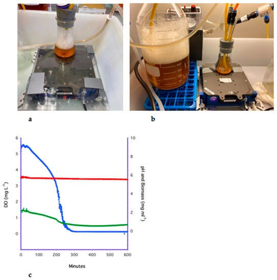 The impeller method (Figure 4a) was very effective for transferring oxygen over the air-medium interface. The average rate of aeration was 0.15 ± 0.16 mg L−1 min −1 and DO remained high for all replicated experiments. A typical time series is shown in Figure 4b, where DO in the YPD culture was initially 6.8 mg L−1 and biomass was 2.8 mg mL−1 (the pH sensor failed). After diluting the culture with low DO medium (0.5 mg mL−1 oxygen), DO was reduced from 6.8 to 3.8 mg L−1, however, mixing rapidly increased DO to 5.7 mg L−1 within 10 min, and equilibrated at approximately 6 mg L−1.