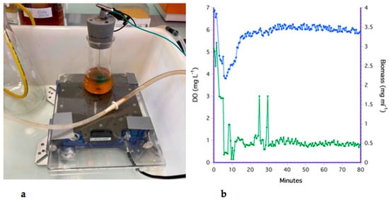 For the flat plate filter, low DO medium was inoculated with yeast and circulated over the membrane using the recirculating pump. The average aeration rate was −0.21 ± 0.35 mg L−1 min−1, indicating that the membrane could aerate the cultures. Figure 6 shows that DO was unable to increase in concentration and remained low even when the biomass was diluted from 8.9 to 2.3 mg mL−1 with low DO medium. After shaking the flask (at t = 77 min) to mechanically aerate the bioreactor, the DO increased slightly to 2 mg L−1 but rapidly decreased again.