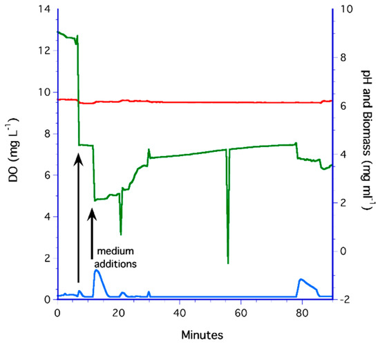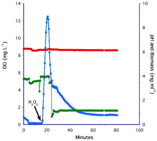 YPD medium was chemically oxygenated by adding hydrogen peroxide, which gave a mean aeration rate of 0.40 ± 0.15 mg L−1 min−1. However, for all replicated experiments, dissolved oxygen decreased over time to anoxic levels. This is illustrated by the time series in Figure 5 where the anoxic medium increased from DO < 0.5 mg L−1 to 12 mg L−1 within 5 min but was reduced to 1.1 mg L−1 in less than 30 min. Coincident with the addition of H2O2, biomass deceased from 4 mg mL−1 to a steady-state value of 1.2 mg L−1, which may have been a response of cells to the strong oxidizing potential of peroxide (O22−), which is toxic for the yeast.