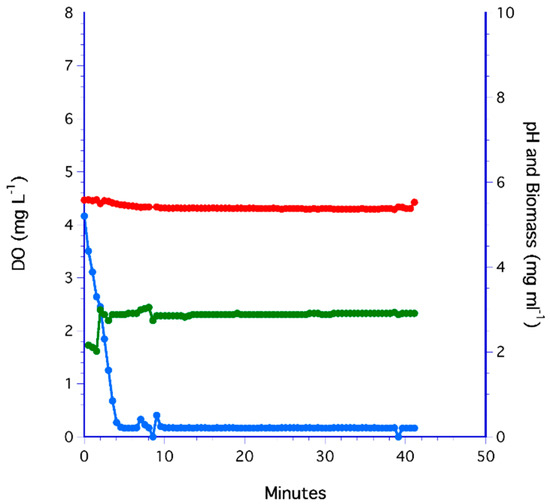 Biomass was initially steady at 1 mg mL−1 when DO was high, but as oxygen was depleted, biomass fell to a minimum of 0.35 mg mL−1 over a 10 h period. Biomass increased again during anoxic conditions to a high of 2.1 mg mL−1. The pH decreased linearly from 7.4 to 5.8 as respired CO2 increased. Thereafter, pH was nearly constant at 5.8.