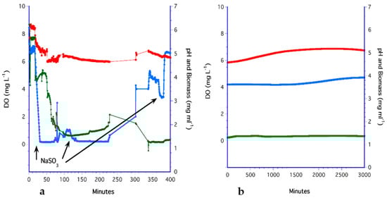 (a) PDMS hollow-fiber filter using SC medium with additions of Na2SO3; (b) longer term, time series of the steady-state culture using the PDMS bioreactor with SC but no Na2SO3 additions. Colors are blue for DO, red for pH, and green for biomass.
