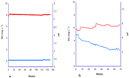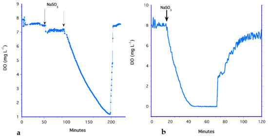 To determine the KLa for the SC medium, Na2SO3 was added periodically and the increase in DO was monitored. The result was an average aeration rate of 0.34 ± 0.13 mg L−1 min−1. As a control, FDIW was substituted for SC resulting in an average aeration rate of 0.37 ± 0.12 mg L−1 min−1. Both these processes are illustrated in Figure 11. DO of the SC medium was initially high and constant at 7.6 mg L−1 which decreased to 7.1 mg L−1 after the first addition of Na2SO3 (Figure 11a). A second addition reduced DO to 1.2 mg L−1 at a rate of −0.05 mg L−1 min−1, but the medium rapidly reached a DO of 7.6 mg L−1 at a rate of 0.69 mg L−1 min−1. The same trend occurred using FDIW, where the DO was initially high and constant at approximately 8 mg L−1 (Figure 11b). After Na2SO3 was added to the FDIW, DO decreased to <1 mg L−1 but was soon re-aerated by the filter.