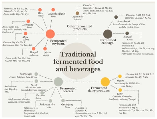 Recently, interest in consuming traditional fermented foods made from a wide variety of raw materials, microorganisms, and manufacturing techniques has increased worldwide. It is estimated that around 3500 different fermented foods and drinks based on milk, vegetables, or fruits are produced globally. Traditional fermented foods and beverages provide a significant source of nutrients depending on the substrate used for their production. Fermented foods based on soybean and cabbage (chungkookjang, doenjang, meju, gochujang, natto, sauerkraut, tempeh) are a source of protein, essential fatty acids (linoleic and linolenic), soluble fiber, minerals such as iron and zinc, as well as vitamin K, vitamin B9, B1, and B6. Similarly, certain fermented foods made from milk (yogurt, kefir, dahi) contain mainly high-biological value proteins, calcium, and vitamins B2, B12, and B9. In contrast, fermented foods made from cereals (pozol, red yeast rice) possess essential amino acids (threonine, valine, isoleucine, leucine) and insoluble fiber (Table 1 and Figure 1).