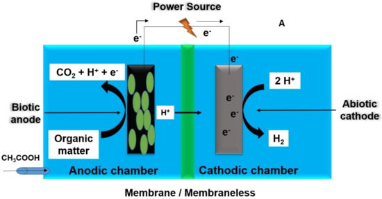 MFCs trigger the chief growth and development of the microbial electrochemistry discipline and generate electricity utilising the microorganisms that are capable of handling and growing on the electrode (in this case, anode) surface, along with the ability to use electrodes as an e− acceptor for the oxidation of organic compounds. In such systems, the electrical force is accumulated from the anodic response and the cathodic half-reactions take place simultaneously (like a decrease in O2) [40].