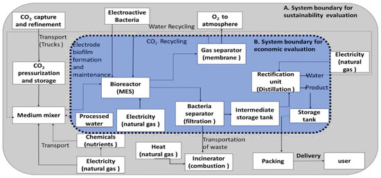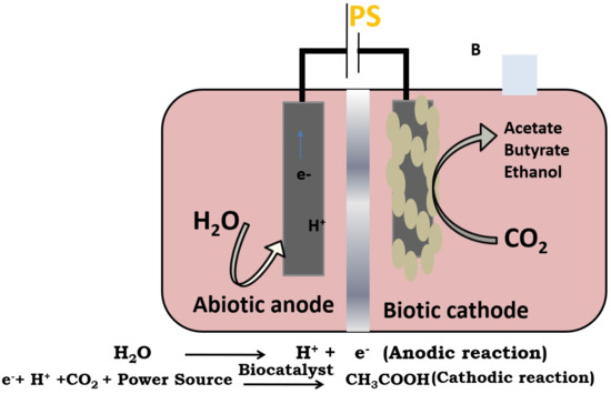 The MES process imitates the natural photosynthesis process if the external power is supplied from a renewable solar source, depicting plenty of advantages as compared to the bioenergy procedure that depends on photosynthesis [9,10]. Some studies have shown that Gram-negative (most efficient being Sporomusa ovata DSM-2662) and Gram-positive (like Moorella thermoacetica and Clostridium spp.) acetogenic bacteria gain electrons from graphite electrodes and act as an electron (e−) donor in the reduction of CO2-producing multi-carbon compounds extracellularly. A strain named Clostridium ljungdahlii is capable of MES, which can be genetically controlled and can be used to generate high-valued commodities [21,22,23,24,25].