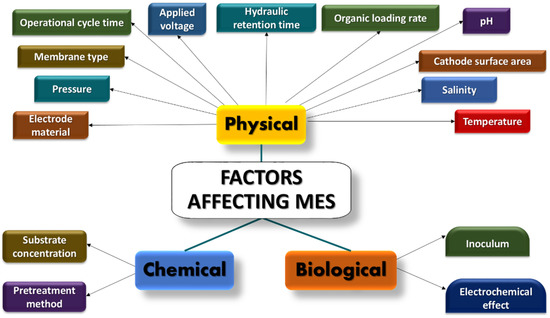 It is imperative to enhance the MES’s performance and optimise it while maintaining a low budget [114]. During the anodic and cathodic processes, the electron transfer system of bacteria is likely to follow their different path. So, the electrode materials don’t need to yield good results in both the microbial cathode and microbial anode equally [115]. Various factors (physical, chemical and biological) affect MES differently, these have been depicted in Figure 4.