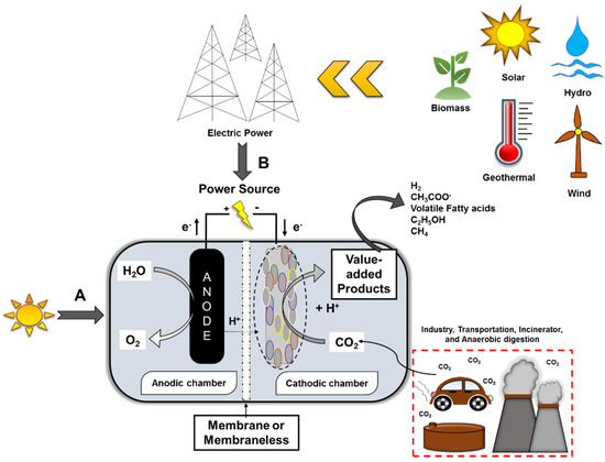 Carbon dioxide is naturally abundant (about 0.03% to 0.04%) in the atmosphere and is eventually responsible for the ecological balance of the ecosystem [1,2]. However, the ever-increasing population and the energy demands have led to changes in the natural cycles of greenhouse gases (including CO2). Industrial emissions and the misuse of fossil fuels have led to about a 40% upsurge in the total atmospheric CO2 and about a 78% rise in the greenhouse gases concentration from 1990 to 2016. Hence, the accumulation of carbon dioxide has led to absorption and re-emission of heat, attributing to an additional warming of the planet [2,3,4,5,6,7]. The changes in the land-use practices predominantly, deforestation and more use of agricultural land, cement production, use of fossil fuels for energy generation and transportation are the major factors contributing to the carbon emissions [3,4,5,6]. CO2 can be captured and converted into carbon-neutral value-added products via microbial electrosynthesis (MES) [8].