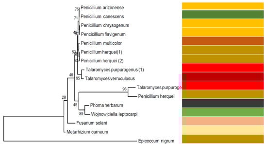 Phylogenetic tree displaying clusters of isolated fungi with pigment-producing abilities.
