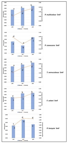 Mycelial biomass and pigment intensities of selected fungi on green waste supplemented with whey protein using submerged fermentation (SmF) method, categories with different letter superscript showed significant differences p ≤ 0.05.