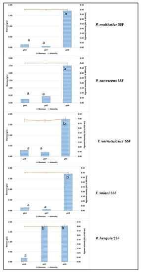 Biomass production was significantly lower than the pigment intensity at pH 4 and 7 when using the solid-state method, except for P. herquie at pH 7. For P. multicolor and F. solani at pH 7, the biomass was substantially lower than at pH 4 and 9, this observation could be attributed to stunning growth affecting mycelial development. For all the isolates, biomass production was higher at pH 9. According to Lebeau et al. [33] and Venkatachalam [5], higher biomass yields are significantly important for fungal species that produce intracellular pigments, this is mainly due to the encapsulation of pigments in mycelial bodies, higher mycelial bodies correlate with higher pigment yield or intensities. This is similar to the findings made in this study where the intracellular accumulation of intense pigments occurred in solid-state fermentation as illustrated in Figure 6.