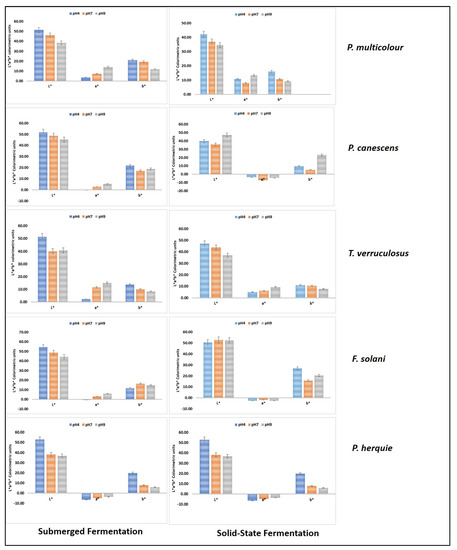 Figure 7, gives the colour indexes L*a*b*, the hue angles and Chroma values of pigments produced submerged and solid-state fermentation by the five selected fungal isolates at pH 4, 7 and 9 respectively. According to Wheltze [39], the L* measures lightness vs. darkness where values (0–50) are considered dark and (51–100) are light. Further, the a* measures red vs. green, a positive value indicates red whereas a negative one indicates green. Finally, the b* measures the relation between yellow and blue, similarly, a positive value indicates yellow and a negative one blue.