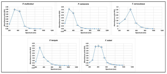 Finally, the absorbance spectrum for the selected isolates is given in Table 3 and Figure 8. The majority of the pigments had a lambda max with higher absorbance in the UV region (200–400) although other absorbance(s) were recorded in the visible region (>400).