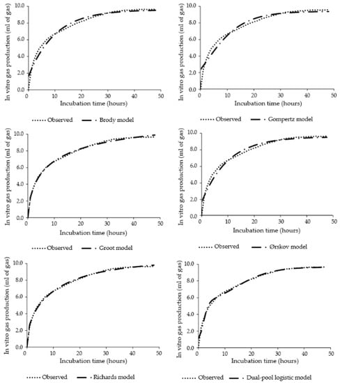- Gurgel, A.L.C.; Morais, J.A.S.; Santana, J.C.S.; Difante, G.S.; Emerenciano Neto, J.V.; Ítavo, L.C.V.; Ítavo, C.C.B.F.; Oliveira, V.S.; Rodrigues, M.J.S.T. Mathematical models to adjust the parameters of in vitro cumulative gas production of diets containing preserved Gliricidia. Ciência Rural 2021, 51, e20200993. [Google Scholar] [CrossRef]