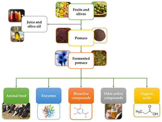Among the possible solutions to manage pomaces, fermentation has been suggested to obtain high-added value products and compounds. Moreover, fermentation can be seen as an important and more sustainable strategy to treat food industry residues [2,27,28]. Thus, this review aims to provide an overview of the utilization of fermentation (mainly involving lactic acid bacteria and yeasts) and biotransformation (biotransformation) of pomace in the production of silage and supplement feed for animal, enzymes, polyphenols, bioactive compounds (release of bound polyphenols and the synthesis of fatty acids and carotenoids), odor-active volatile compounds, and organic acid production.