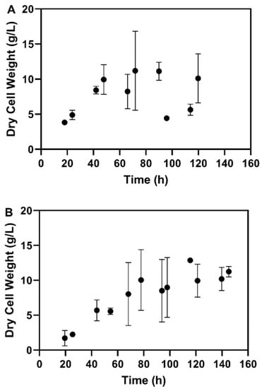 The shake flask cultivations with animal fat rest materials (15 g/L) were conducted for 120 h in the case of M. circinelloides and 170 h for M. alpina. The results indicate that both strains can grow on animal fat as the sole carbon source (Figure 3). M. circinelloides cultivated on animal fat showed a similar growth trend as on glucose, but with slightly higher biomass concentration and total lipid content (Figure 4). The final biomass concentration and lipid content for M. circinelloides were 16.7 ± 2.2 g DCW/L and 54.1%wt (Figure 4A). However, the linoleic acid and GLA content dropped almost by half for fat-grown M. circinelloides compared to grown on glucose. Figure 3B shows that M. alpina grew slower on animal fat and had a longer lag phase. The final biomass concentration (6.4 ± 0.9 g DCW/L) and arachidonic acid content (19.7%wt) for M. alpina grown on animal fat were significantly lower than for the cultivation on glucose (Figure 3B and Figure 4B). However, total lipid content was quite similar for both substrates: 52.7%wt for cultivation on animal fat, compared to 54.6%wt on glucose (Figure 2B and Figure 4B).