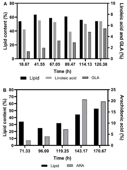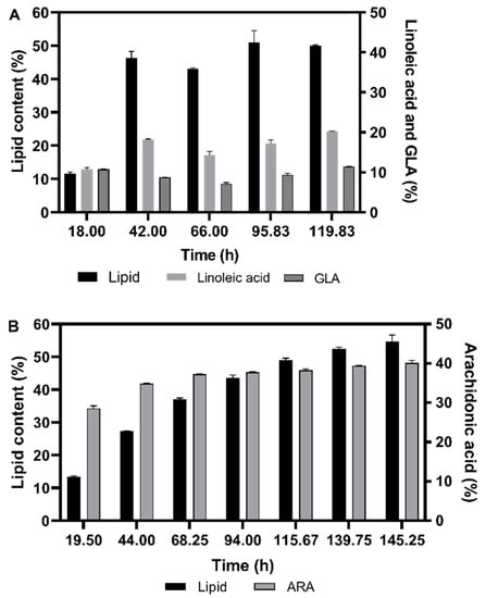 (A) Total lipid content (%wt of dry cell weight), linoleic acid, and GLA (%wt of total lipid weight) for M. circinelloides, and (B) total lipid content (%wt of dry cell weight) and arachidonic acid (ARA) content (%wt of total lipid weight) for M. alpina, grown on glucose in shake flasks.