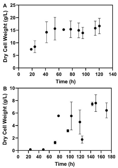 Growth curve profiles for: (A) M. circinelloides, and (B) M. alpina, grown on glucose in shake flasks.