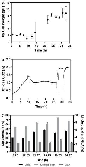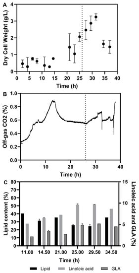 (A) Dry cell weight, (B) off-gas CO2 profile, and (C) total lipid content (%wt of dry cell weight), linoleic acid, and GLA (%wt of total lipid weight) obtained during fed-batch cultivation of M. circinelloides in fermenter using animal fat rest materials. The dotted vertical line indicates the beginning of feed phase.