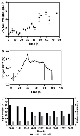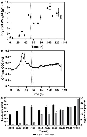 (A) Dry cell weight, (B) off-gas CO2 profile, and (C) total lipid content (%wt of dry cell weight) and arachidonic acid (ARA) content (%wt of total lipid weight) obtained during fed-batch cultivation of M. alpina in fermenter using animal fat waste. The dotted vertical line indicates the beginning of feed phase.