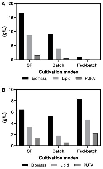 In this study we investigated the bioconversion of animal fat by-product materials into unsaturated SCO by oleaginous filamentous fungi M. circinelloides and M. alpina. Three types of cultivations—shake flask, batch, and fed-batch fermentations—were performed. In addition, the shake flask cultivations on glucose as a carbon source were carried out for reference. For both strains grown on glucose in the shake flasks, the biomass concentration was lower and lipid content was higher than previously stated by Kosa et al., 2018, 2017 [,]. The lipid content of M. circinelloides was relatively constant after 42 h of growth. This was also observed in the previous studies [,], indicating the depletion of nitrogen source and the stationary phase of cells. Production of ARA in M. alpina was similar to the previously reported results [,], whereas the total lipid content increased steadily signifying the slow depletion of nitrogen source which is mainly due to the slow growth of cells.