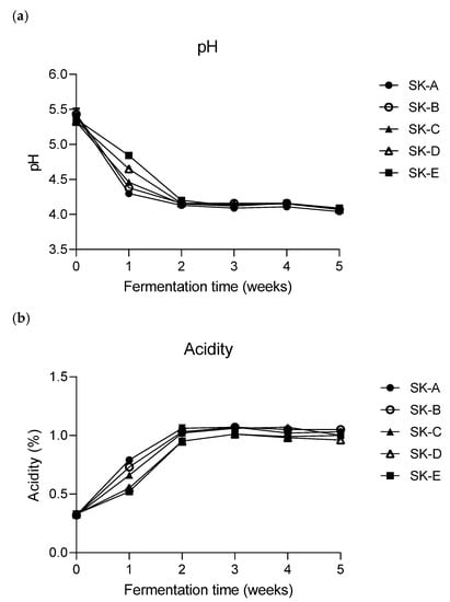 3.2. Changes in the pH and Titratable Acidity of Kimchi