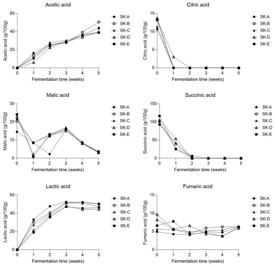 - Shim, S.M.; Kim, J.Y.; Lee, S.M.; Park, J.B.; Oh, S.K.; Kim, Y.S. Profiling of Fermentative Metabolites in Kimchi: Volatile and Non-Volatile Organic Acids. J. Korean Soc. Appl. Biol. Chem. 2012, 55, 463–469. [Google Scholar] [CrossRef]