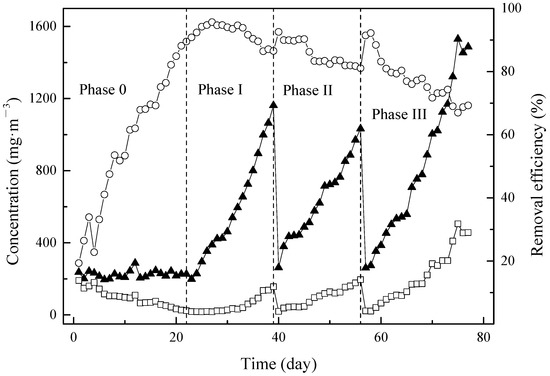 After the startup period, the BTF was tested under different conditions from phase I to phase III. The variations of inlet and outlet concentration of mixture pollutants in different phases are shown in Figure 1. EBRTs of 56 s, 28 s and 20 s were designed for phase I to phase III.