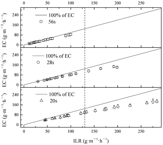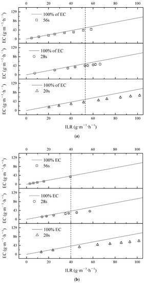 The different EC corresponding to ILR variations for the mixed pollutants treatment is presented in Figure 2. The behavior of BTF in mixture pollutants treatment also can be categorized into two parts according to liner regression: (I) diffusion constraints (DC, up to 130.00 g·m−3·h−1 of ILR according to Figure 2); and (II) reaction constraints (RC, ILRs greater than 130.00 g·m−3·h−1). Diffusion rate and reaction rate both significantly affected the total behavior of BTF during the operation [47,48,49]. In DC, reaction rate in the biofilm was greater than the diffusion rate from the gaseous phase to aqueous phase, and as a result, diffusion rate was the limiting factor, in terms of a lower ILR. Contrarily, with a higher ILR, the diffusion rate was greater than the reaction rate; the resulting reaction rate was to be the control factor. Thus, it could be due to the restriction of reaction rate, data slightly deviated from line of 100% of EC when ILR grew higher.
