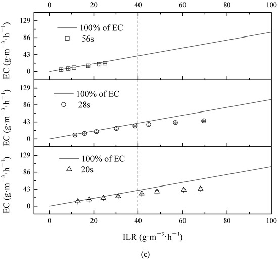 The variation of EC with different ILR under different EBRTs for DMS, propanethiol, and toluene in mixture treatment by BTF is presented in Figure 3a–c. At high ILR, ECs of DMS did not deviate far from the ideal line of the 100% removal line. The tendency of propanethiol and toluene were similar. As shown in Figure 3a–c, the maximum EC of DMS and propanethiol were observed on maximum ILR under EBRT of 20 s; however, the maximum EC of toluene occurred under EBRT of 28 s. It confirmed that marginal toluene ILR of RC was lower than the other two contaminants.