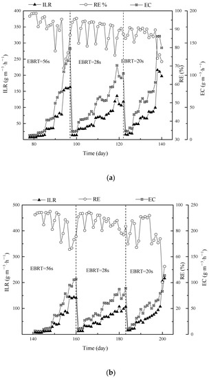 The performance of the BTF is evaluated by eliminate capacity (EC) (g·m−3·h−1), EBRTs, and RE (%). EC is the measurement of contaminant removal capacity at a given ILR. EBRT is the measurement of gas residence time within the reactor medium. ILR, EC, EBRT, and RE were calculated using the following equations: