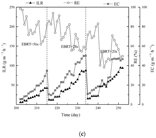 Figure 2 and Figure 3 show that the total maximum EC of overall contaminants were achieved at 80.70 g·m−3·h−1 (DMS 50.4%, propanethiol 31.3%, toluene 18.2%), 145.91 g·m−3·h−1 (DMS 37%, propanethiol 28.9%, toluene 34.1%) and 189.70 g·m−3·h−1 (DMS 40.0%, propanethiol 36.3%, toluene 24.0%) at different EBRTs of 56 s, 28 s, and 20 s, respectively. Among these pollutants, the value of ILR in terms of certain EC followed the order: DMS > propanethiol > toluene; DMS was thus the most stubborn chemical among these three in treatment.