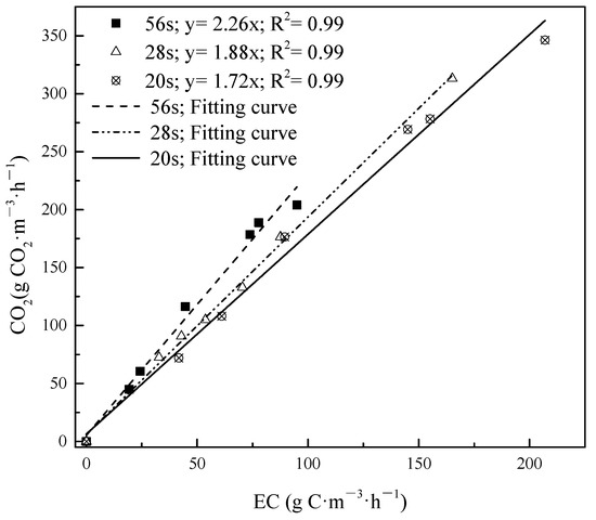 In the biofiltration process, the organic contaminants are eventually converted to either water and carbon dioxide or biomass. Therefore, the CO2 production (P CO2) is an essential parameter corresponding with mineralization level. The effect of P CO2 on the EC for various EBRTs is presented in Figure 5. The linear fitting of experiment data under different EBRTs during the mixture gas treatment were y = 2.26x (EBRT of 56 s), y = 1.88x (EBRT of 28 s), and y = 1.72x (EBRT of 20 s). In case of the inlet concentration ratio of DMS, propanethiol and toluene were 2:1:1; therefore, the stoichiometric ratios of P CO2 per mass of completely degradation of mixture contaminants were 2.0, 3.0 and 7.0 respectively. Maximum ECs and P CO2 coefficients of different individual pollutants and mixtures were as shown in Table S2, and among them P CO2 of toluene was studied in various research. Compared to the results in the present study, the P CO2 values in this study were relatively high, in terms of difference between three typical contaminants. The high mineralization rate of mixture contaminants revealed these compounds were entirely converted to water and CO2. The discrepancy between experimental data and stoichiometric values were sensible to explain as an accumulation of biomass in BTFs and partial CO2 was dissolved in the MSM as formed H2CO3, HCO32−, or CO32−, in terms of the degradation process taking place in the aqueous phase.