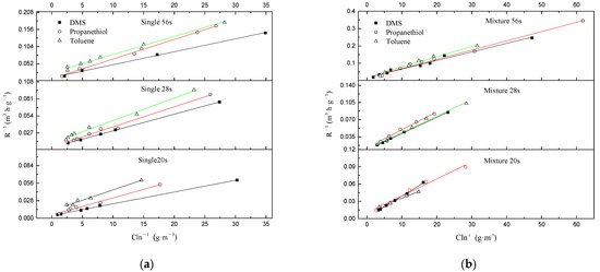 The rmax and Ks under different EBRTs for DMS, propanethiol and toluene either in a single or in a mixture gas supply were calculated via Equation (5). As shown in Figure 6a,b, the variation of rmax value and Ks corresponded with EBRTs in single and mixture treatment during three phases. For single treatment, rmax of DMS, propanethiol and toluene were initially enhanced since EBRT decreased from 56 s to 28 s, and declined with continued decrease of EBRT from 28 s to 20 s. Ks of DMS and toluene followed the rmax tendency. However, Ks of propanethiol decreased straight if EBRT dropped. The Ks value indicated that during the single contaminant condition, propanethiol > DMS > toluene. However, during mixture conditions the comparison was complex, under EBRT 56 s, propanethiol > DMS > toluene, under EBRT 28 s DMS > toluene > propanethiol, under EBRT 20 s propanethiol > toluene > DMS. The solubility of contaminants was propanethiol > DMS > toluene. This confirmed that in a single condition, the solubility would positively relate to Ks [52]. But in mixture conditions, the Ks value was not only related with solubility but also related with other facts such as reaction effect, and the intermediates would also influence the results.