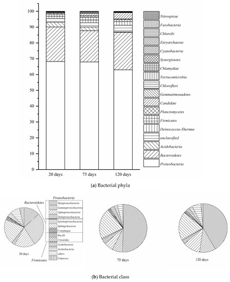 Comparison to quantitative contribution of the sequences affiliated with different (a) phyla, (b) class, and (c) genera to the total number of sequences from microcosm samples at 20 days, 75 days, and 120 days.