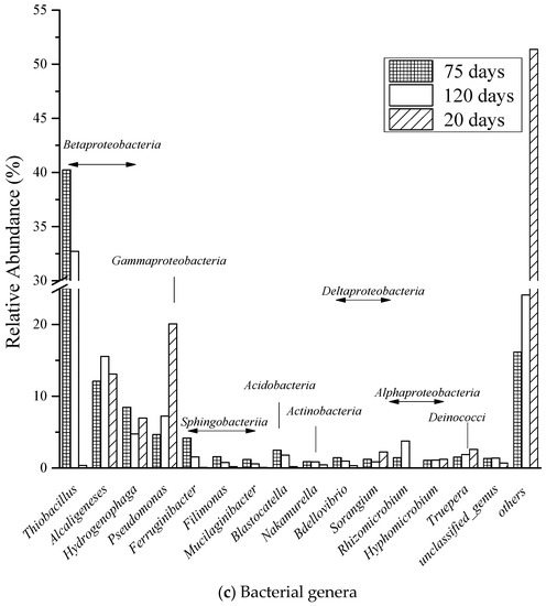 In the present study, the microbial analysis was focus on bacteria, and over 99.99% of obtained sequences were assigned bacteria. On average, 3.05% of the sequences were not classified at the phylum level. As shown in Figure 7a, the seven major phyla were Proteobacteria (66.42% on average), Bacteroidetes (21.76%), Gemmatimonadetes (2.00%), Acidobacteria (1.89%), Deinococcus-Thermus (1.87%), Firmicutes (1.38%), and Candidate (0.69%). The most abundant phylum was Proteobacteria, which ranged from 63.01% to 68.28% in the samples. Among the Proteobacteria as shown in Figure 7b, Betaproteobacteria ranked first with an average percentage of 35.61%, followed by Sphingobacteriia (20.54%), Gammaproteobacteria (15.56%) and Alphaproteobacteria (11.91%). The high percentage of Betaproteobacteria and Grammaproteobaceria was as a result of anthropogenic inoculation of Alcaligenes sp. SY1 and Pseudomonas.putia S1, which was belonged to these classes [23]. Sphingobacteriia and Alphaproteobacteria were also reported as main class to degrade toluene in bioreactor [60,61]. Thus, these bacteria play key role during VOCs and VOC treatment [62]. As shown in Figure 7b, during the first 20 days operation period, Gammaproteobacteria (28.75%) Sphingobacteriia (21.57%), Alphaproteobacteria (17.63%), Betaproteobacteria (13.84%) were the most abundant bacterial class. However, Betaproteobacteria would dramatically increase to 42.25%, with the decrease percentage of Gammaproteobacteria and Alphaproteobacteria to 10.80% and 11.78% for the next 55 days of operation period. At this period, the Sphingobacteriia class was slightly declined to 2.00%. In the last 45 days of operation, Betaproteobacteria still kept the increased tendency to 50.74%, while Gammaproteobacteria and Alphaproteobacteria continued declined slightly to 7.12% and 6.32%. Sphingobacteriia was increased by 1.50% during this period.
