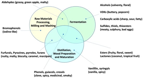 - Piggott, J.R. Whisky, Whiskey and Bourbon: Composition and Analysis of Whisky. In Encyclopedia of Food and Health; Caballero, B., Finglas, P.M., Toldrá, F., Eds.; Academic Press: Oxford, UK, 2016; pp. 514–518. [Google Scholar] [CrossRef]