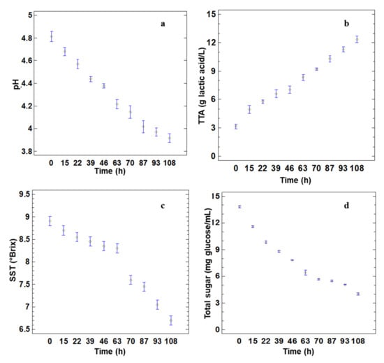 The results of pH, total soluble solids, total titratable acidity (T.T.A.), and total sugars of the fermented liquor from shrimp waste are shown in Figure 2.