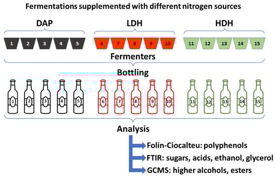 The experiments were designed to test the effects of 3 nitrogen sources: diammonium phosphate (DAP), yeast hydrolysate DH 3.5% (LDH), and yeast hydrolysate DH 10% (HDH). Experiments supplemented with DAP were designed as controls, while those supplemented with LDH and HDH corresponded to treatments with low and high degrees of hydrolysis hydrolysates, respectively. Fermentation experiments were performed with 5 replicates for each nitrogen source, resulting in a total of 15 experiments.