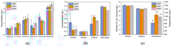 Figure 3. The highest concentration of acids corresponded to lactic and tartaric acids. High variations in replicates (error bars) were observed for malic and lactic acids. The variations can be attributed to variations in malolactic fermentation, suggesting a lack of homogeneity among replicates. The variations in tartaric acid can be explained by a nonhomogeneous precipitation of this acid among the replicates. The highest acidity was obtained in the wine supplemented with HDH, followed by the LDH- and DAP-supplemented wines. The residual sugars were between 1.2 and 1.4 g/L in the different wines. Glucose presented the same residual concentration, while fructose was different depending on the experiment. The highest fructose concentration was obtained in batches supplemented with DAP. A lower concentration was obtained in the wines supplemented with YPH, consisting of the same value for LDH- and HDH-supplemented wines. Ethanol and glycerol production levels were similar among the different nitrogen supplementations. Polyphenols resulted in different concentrations, depending on the nitrogen source supplemented. Both YPH supplementation, LDH, and HDH resulted in higher concentrations of polyphenols compared with the DAP-supplemented wine. The only difference observed during fermentation was the sugar uptake rate. Faster production of ethanol in batches supplemented with YPH could cause a higher extraction of polyphenols. This inference is not supported by our evidence or by antecedents. Fermentations supplemented with YPH were faster, consumed more sugars, and obtained higher acidity and polyphenols compared to DAP supplementation. After the characterization of wines, analysis of volatile compounds was performed.