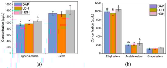 Figure 4. The highest concentration of higher alcohols and esters was obtained in the HDH-supplemented wine. The results agree with previously published data. The production of higher alcohols depends on the availability of amino acids. This evidence shows the feasibility of using YPH as a nitrogen source to promote the formation of higher alcohols. The esters were classified according to their origin, as shown in