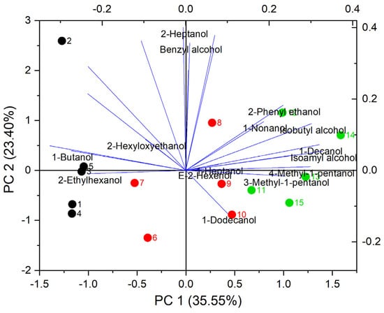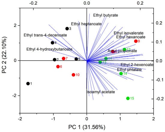 Other relevant higher alcohols are isoamyl alcohol, isobutanol, and 2-phenylethanol. These are located on the right, together with the HDH samples. The PCA results suggest an influence of HDH treatment on the formation of these compounds. The PCA for esters is plotted in