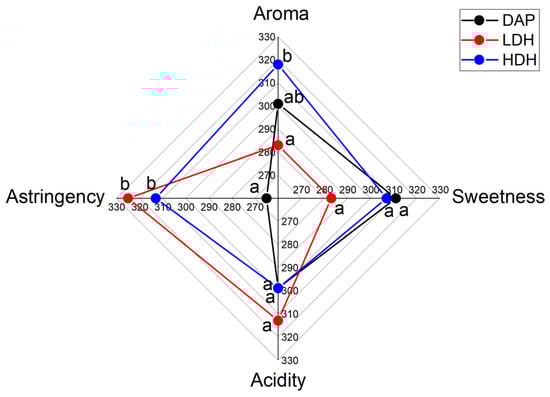 Figure 7. Significant differences between the wines were detected in aroma and astringency. A significant difference in aroma was detected between both YPHs. Astringency differences were detected between DAP- and both YPH-supplemented wines.