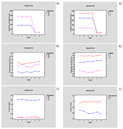 Interaction plots depicting the mean plantaricin activity, population and final pH value, obtained from the combination of two sourdough related parameters. (A1,A2) The effect on mean plantaricin activity (AU/mL), resulting from the in pair interaction of strains with temperatures and substrates, respectively, after growth for 21 h. (B1,B2) The effect on mean population, log (CFU/mL), resulting from the in pair interaction of strains with temperatures and substrates, respectively, after growth for 21 h. (C1,C2) The effect on mean final pH value, resulting from the in pair interaction of strains with temperatures and initial pH value, respectively, after growth for 21 h. Six Lp. plantarum strains were included, namely, LQC 2441, 2422, 2516, 2485, 2320 and 2520 corresponding to 1, 2, 3, 4, 5 and 6, three incubation temperatures, namely, 20, 30 and 37 °C, three substrates, namely, MRS broth, mMRS broth and WFE corresponding to 1, 2 and 3 and two initial pH values (5.0 and 6.0).