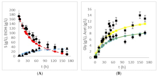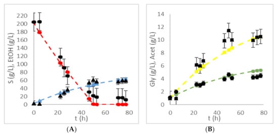 The developed bioprocess model describes the changes in concentration of biomass and main fermentation products detected in all experiments: ethanol, glycerol and acetic acid. This mathematical model was developed by using computing Berkeley Madonna software, version 8.3.14 (Berkeley Madonna, Berkeley, CA, USA). Generally, the kinetic parameters of the developed model can be divided into two groups: fixed and adjustable. The values of fixed and adjustable model parameters are presented in Table 2 and Table 3.