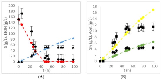 Comparison between experimental (no line) and model values (dashed line) for (A) substrate (●) and ethanol (▲) concentration and (B) glycerol (■) and acetic acid (●) concentration obtained for experiment with constant HRTB rotation mode (10 rpm). Discrepancies between experimental data are presented as error bars.